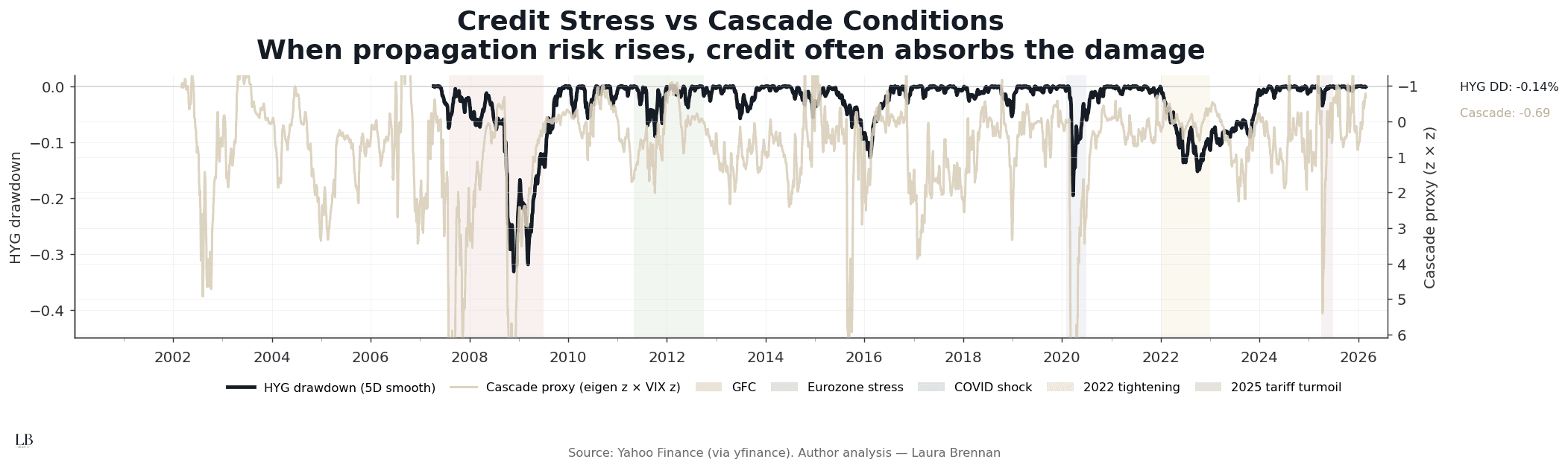 This chart compares high-yield credit drawdown (5D smoothed) with the cascade proxy.