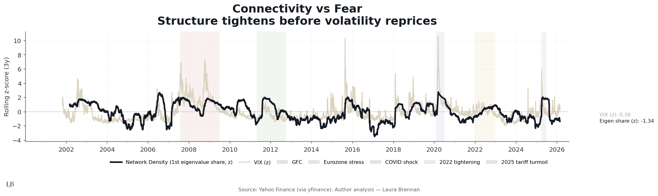 This chart compares rolling network density (first eigenvalue share, 90D window, 3Y z-score) with the VIX.