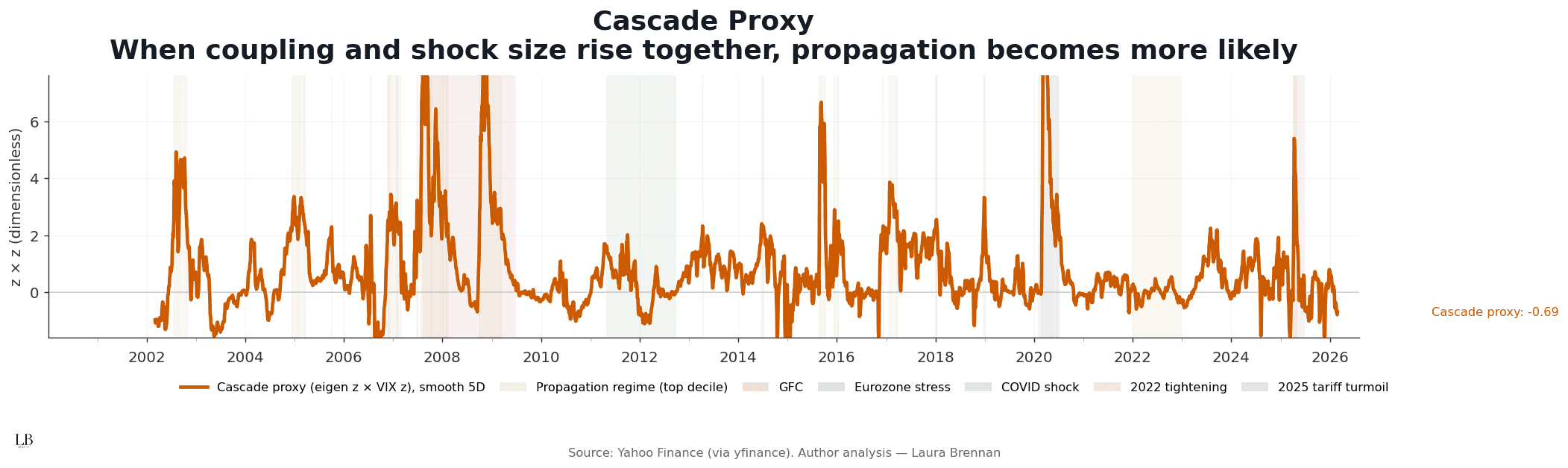 • Cascade proxy: (Eigen z) × (VIX z), 5D smoothing
