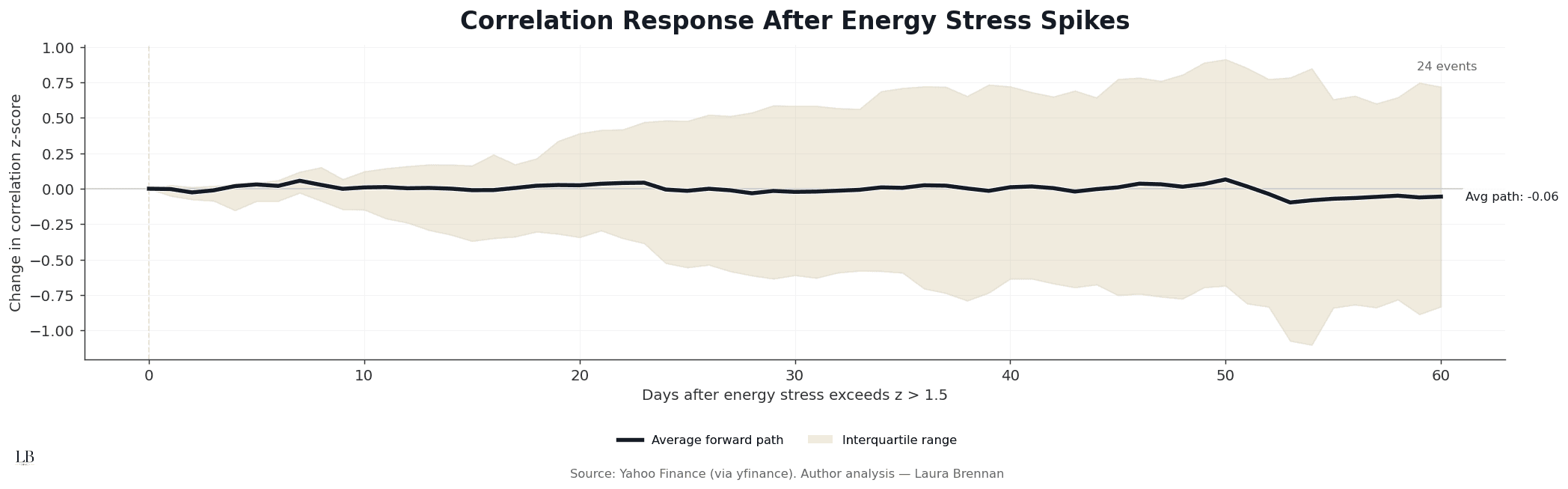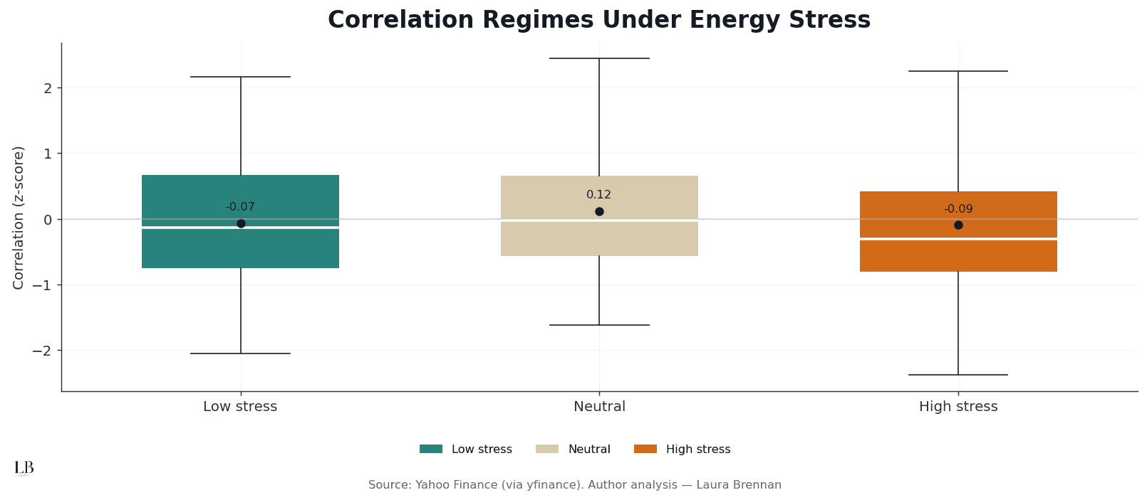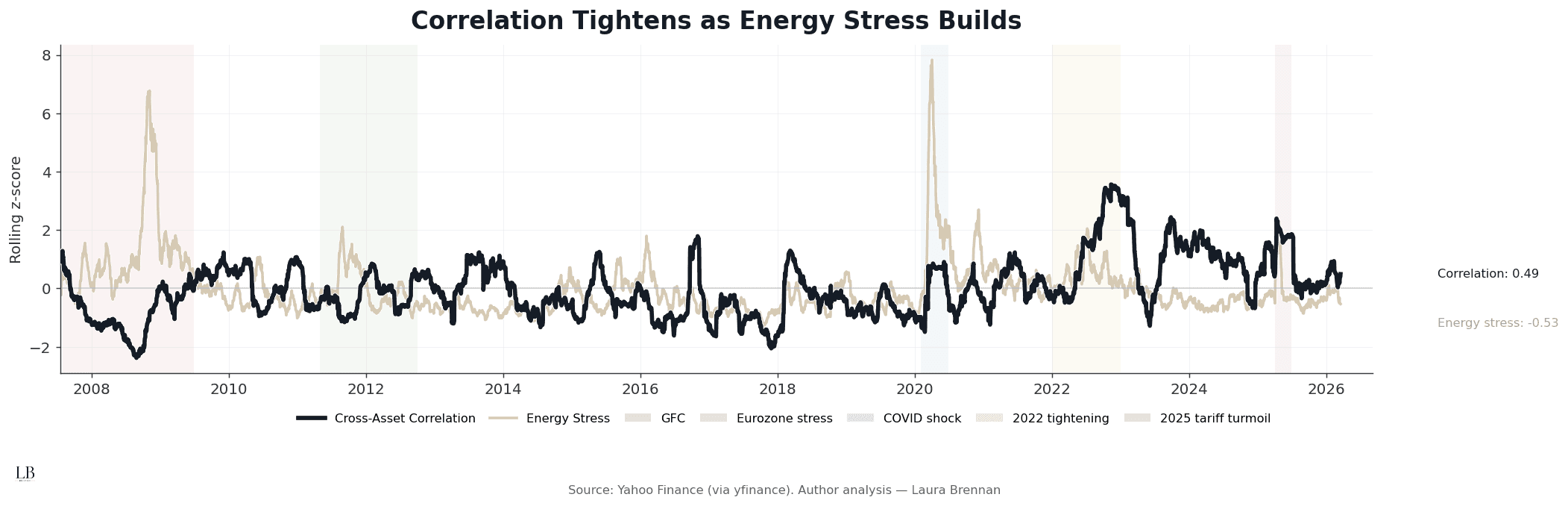 Periods of elevated energy stress coincide with a steady increase in cross-asset correlation.
