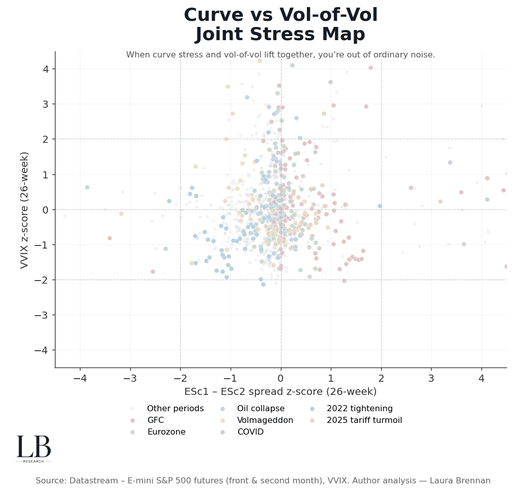When both dimensions elevate together, you are no longer in a normal regime, you are in structure-constrained markets, where positioning, hedging, and volatility supply drive outcomes more than fundamentals.