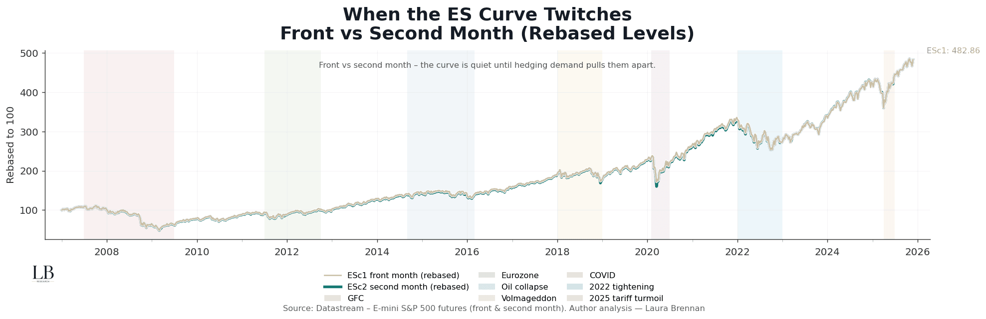 One of the earliest ways to see that shift is through the ES curve, the relationship between the front-month and second-month E-mini S&P 500 futures contracts.
