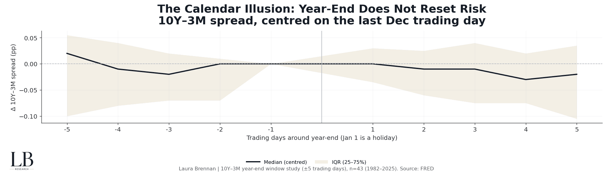 This chart tracks the median path and interquartile range of the 10Y–3M spread across 43 year-ends (1982–2025).