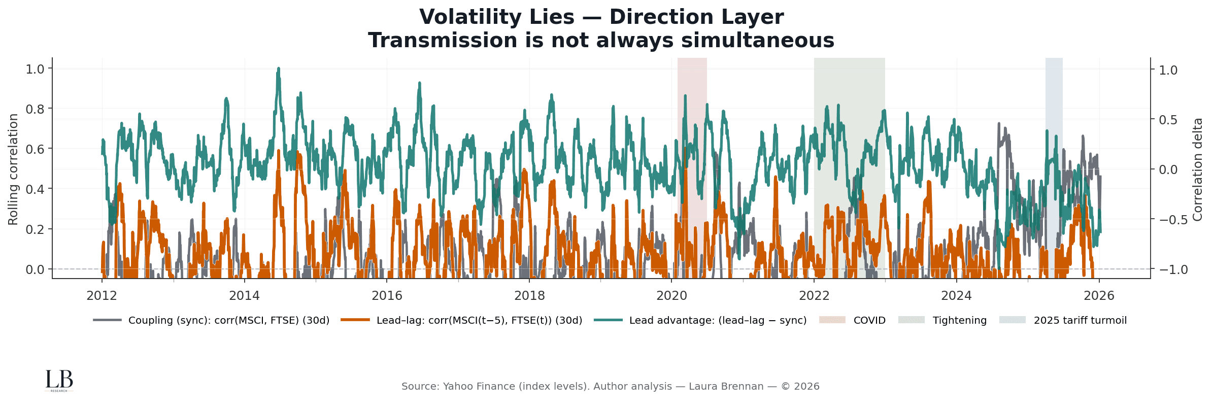 Lead–lag coupling: corr(MSCI(t−5), FTSE(t)) (30-day)
