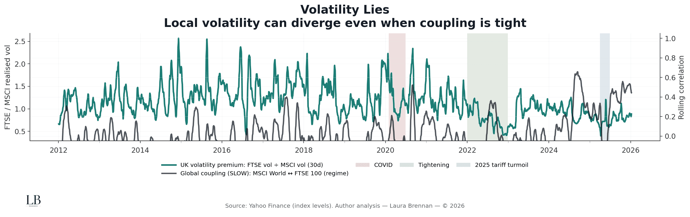 • Global coupling often tightens during low-volatility periods