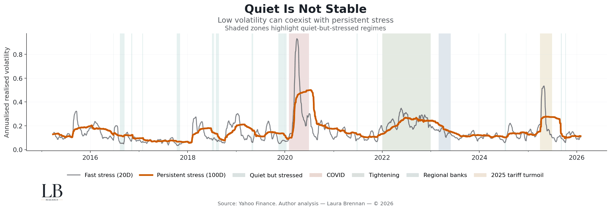 • Quiet-but-stressed regimes: low fast stress with elevated persistent stress