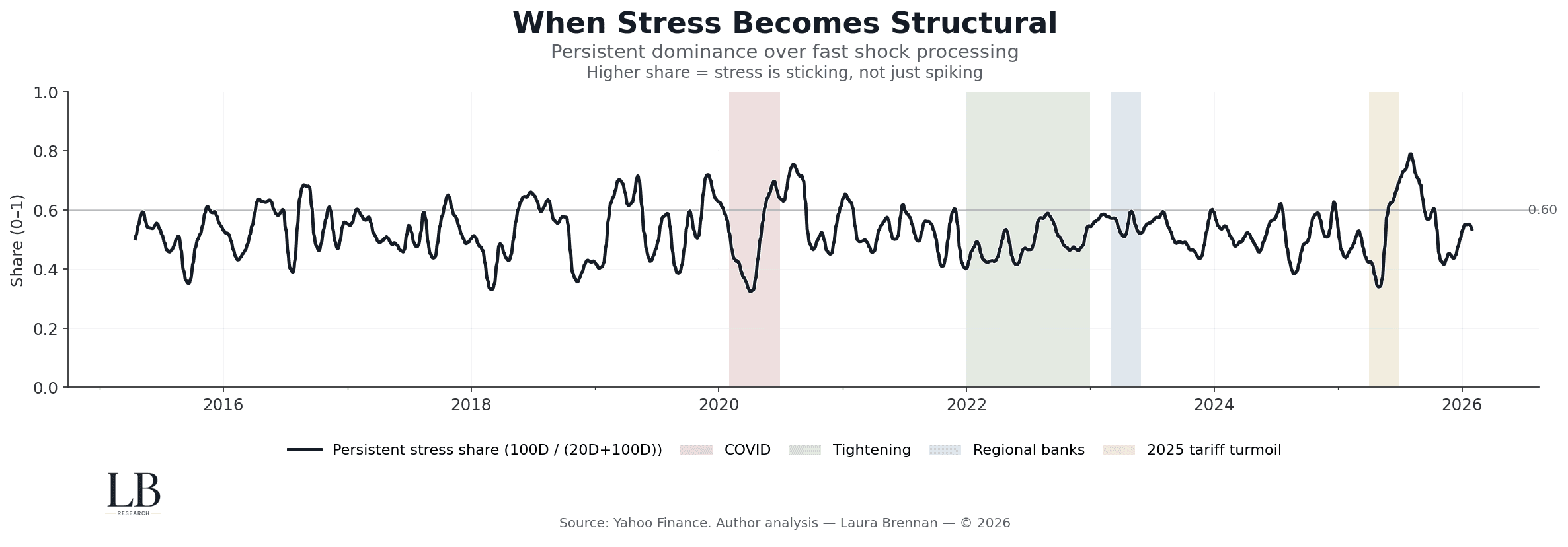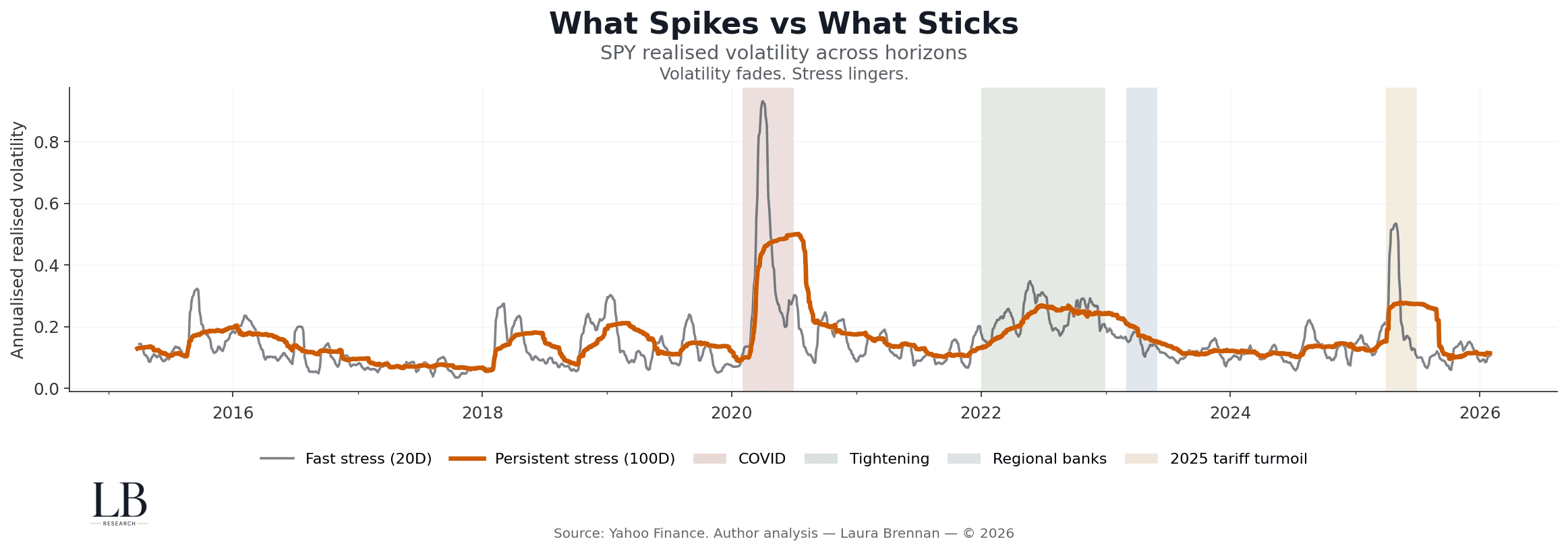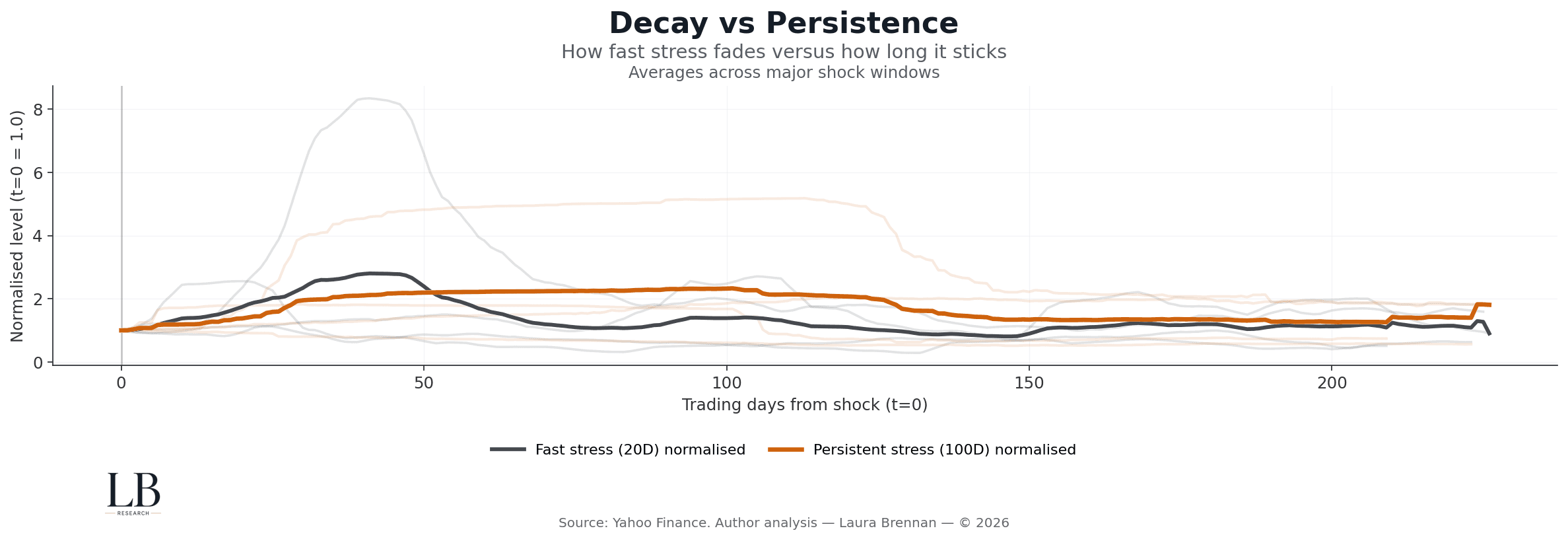 This Insight separates fast stress from persistent stress, showing how volatility spikes are processed rapidly, while deeper structural strain remains embedded in the system long after prices appear calm.