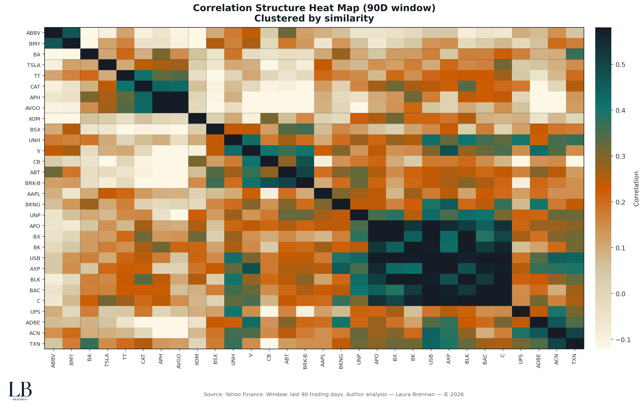 It shows how correlation concentrates into clusters rather than spreading evenly.