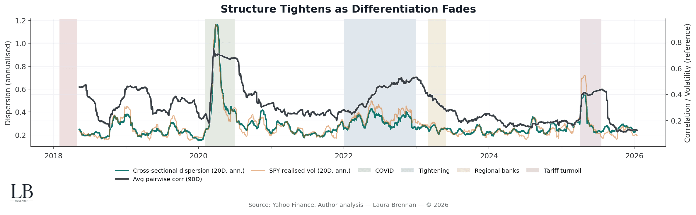 • Dispersion: cross-sectional return dispersion (20-day, annualised)