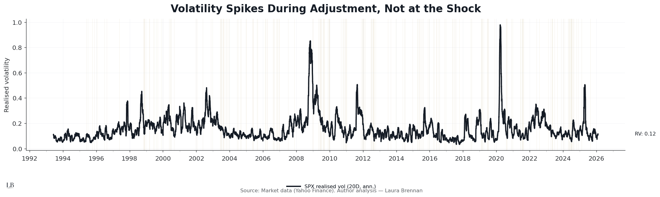 This chart shows realised volatility, aligned with the same liquidity stress regimes.
