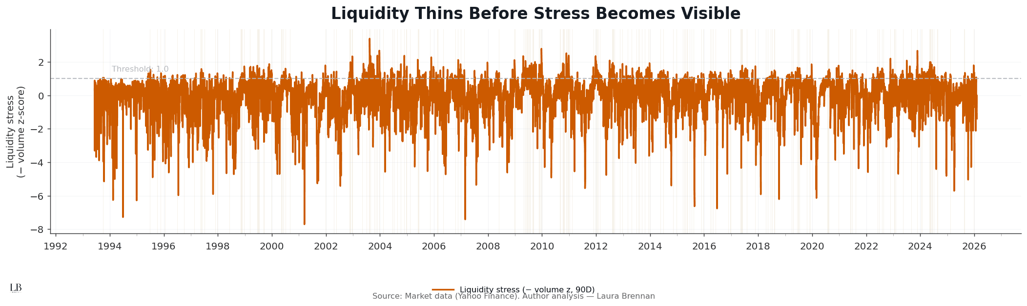This chart tracks liquidity stress, measured as an inverted volume z-score, with shaded regimes marking sustained deterioration in market depth.