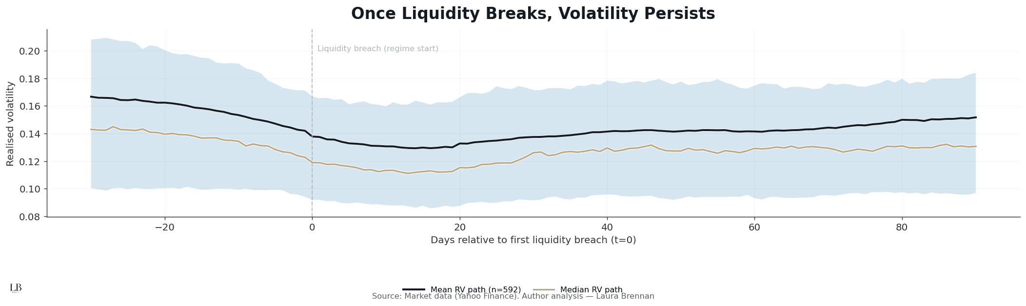 This chart aligns volatility paths around the first transition into a liquidity stress regime, averaged across all episodes.